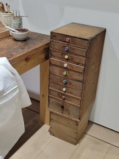 インスタレーション内の道具類は普段メンバーが自身の工房で使っているものを持ち寄っているそう。古いものを塗り替えて、取っ手を手造りの陶器で飾ったかわいらしい道具棚も(これも普段から使っているそう)。今流行りのDIYやリメイクも、工芸の世界では当たり前なのです。