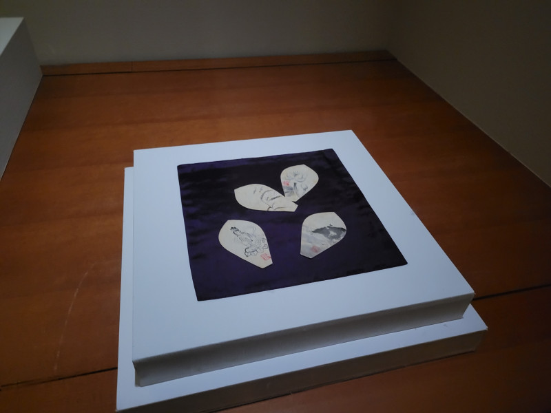 絵の前には華籠があり、脇に散華(仏事の際、供養のために撒く蓮の花弁型の色紙)が置かれています。こちらは實氏の父・良氏(初代古香庵)が仏様を描いたもの。細見父子は収集する作品のジャンルやスタンスの違いから時には衝突することもあったそうですが、「蓮の花」を通じての繋がりを感じさせます。