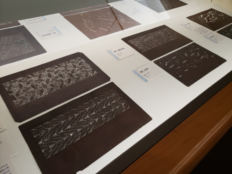 会場では、特に伊勢型紙にスポットを当て、実際に使われた型紙や、人間国宝の職人さんによる作品、そして型紙作りから布を染めるまでの制作の様子も動画で見ることができます(動画は展示会場近くと休憩室にあり、内容が異なります)